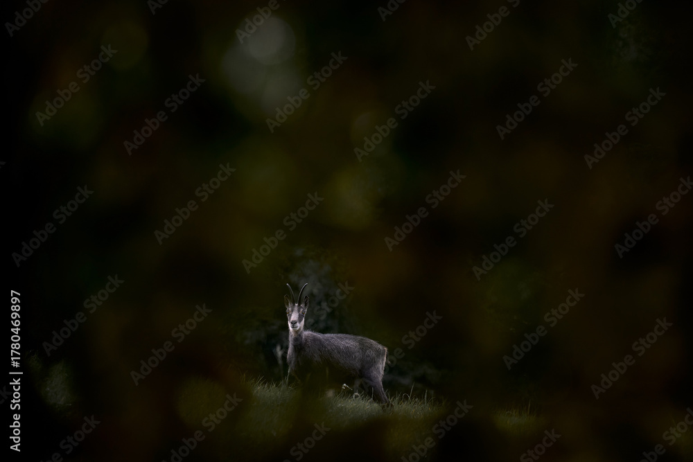 Find the chamois hidden in the forest. Czech wildlife. Chamois, Rupicapra rupicapra, on the rocky hill, forest in background, Studenec hill, Czech Republic. Wildlife scene with horn animal, Chamois. #1780469897