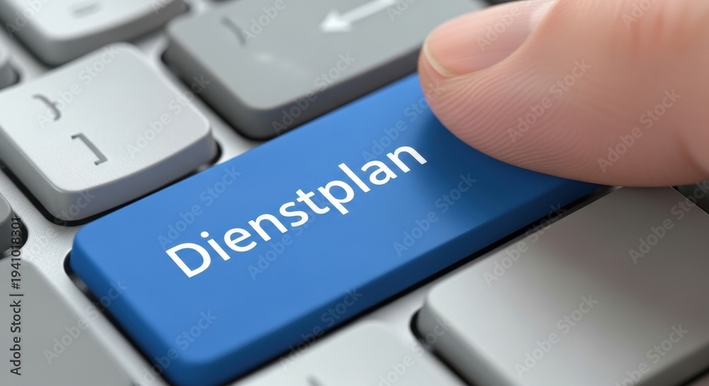 Finger Pressing Blue Dienstplan Button on Keyboard for German Shift Schedule and Roster Concept #1941018301