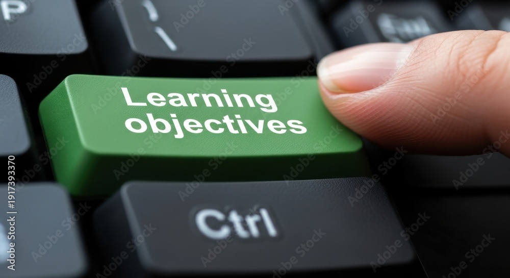 Finger Pressing Green Learning Objectives Button on Computer Keyboard #1917393370