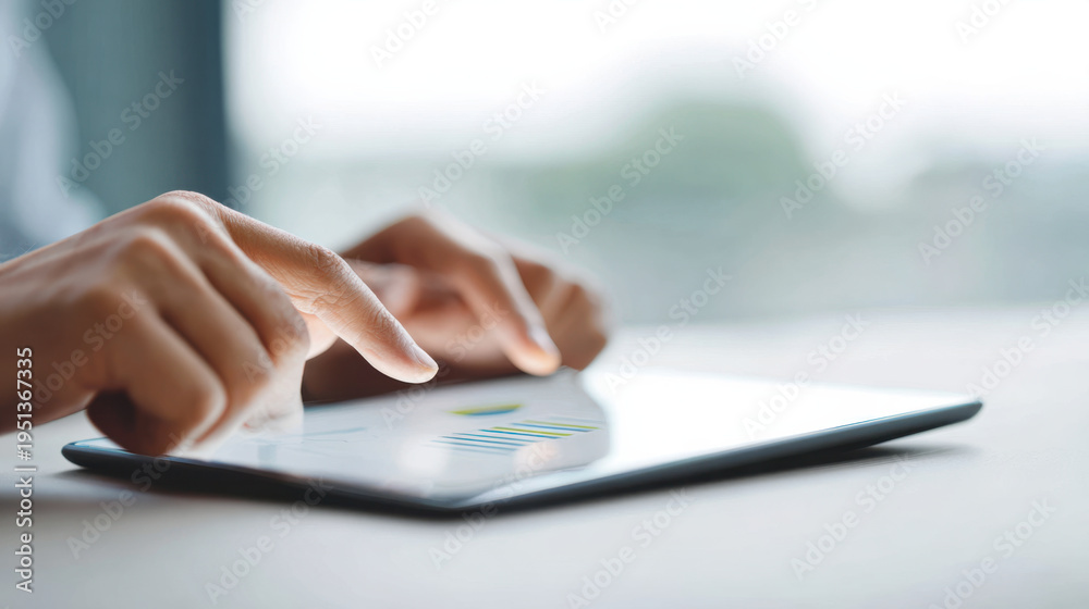 Fingers touching tablet screen with business chart, closeup of hands using digital device for work #1951367335