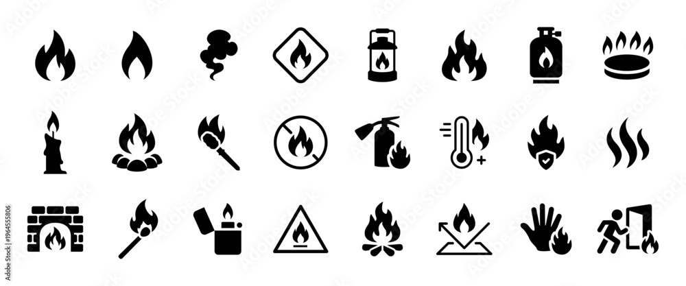 Fire black icon set. Flame, heat, gas and smoke symbols. Flammable danger and fire hazard glyph signs. Campfire, bonfire, fireplace, torch, lighter and match pictograms. Fire emergency concepts. #1964555806