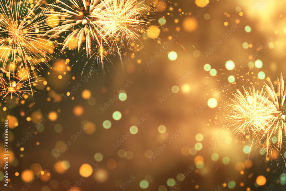 Fireworks and golden bokeh lights, festive background for New Year celebration, holiday event, Christmas or festival concept with copy space for design and joyful atmosphere #1799806203