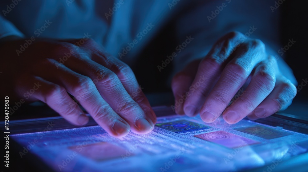 First-Person View of Hands Verifying Check Under UV Light for Security Features #1730470980