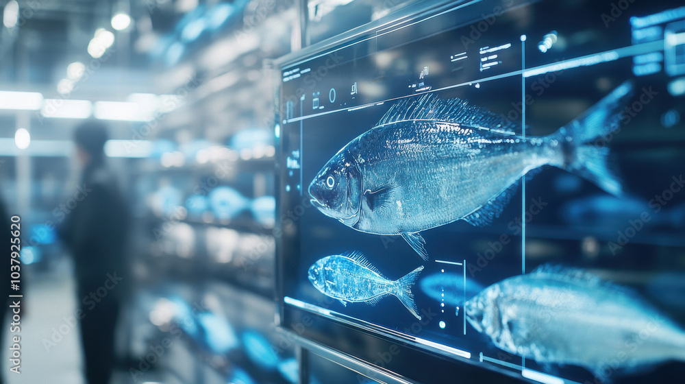 fish and icon on screen technology in lab for food science nutrition concept #1037925620