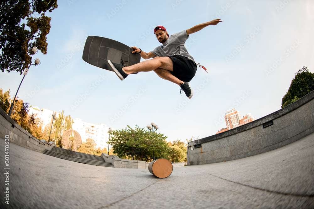 Fish-eye shot from below man making trick on the balance board on the concrete border #301470638