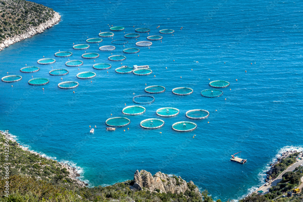 Fish sea farm with floating circle cages and coastline in Greece, aerial view #612286044