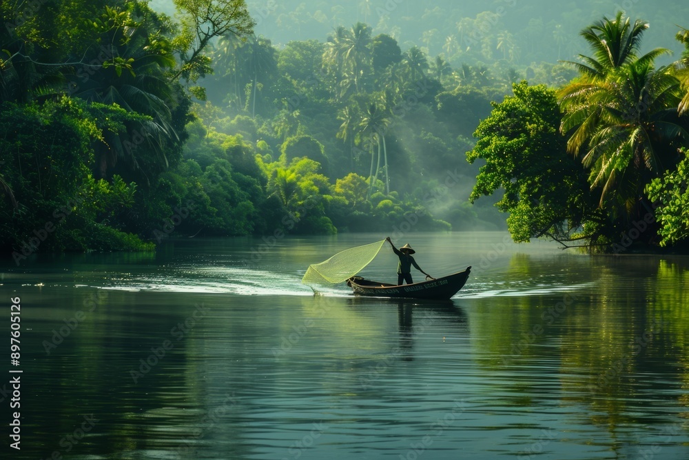 Fisherman Casting Net in Serene Southeast Asian River Amidst Lush Greenery for Nature Photography #897605126