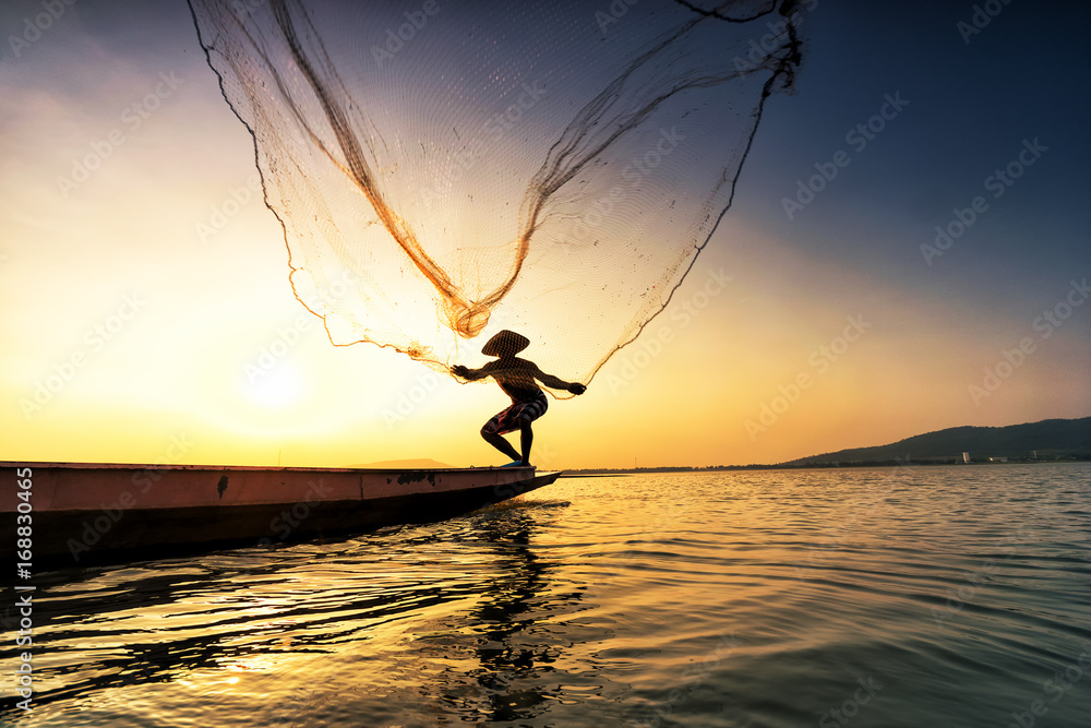Fisherman on a fishing boat in a river at sunset,Thailand #168830465