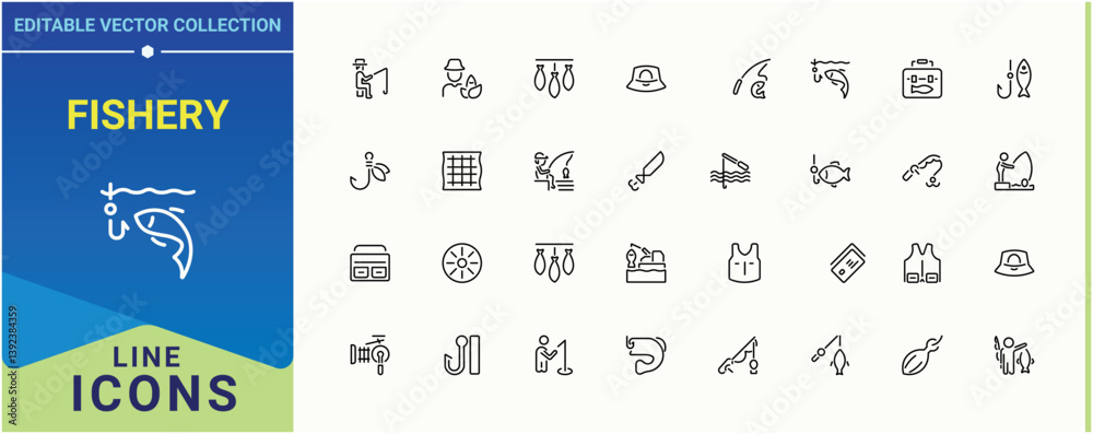 Fishery icon set. Includes thin line symbols fish, fisher, activity, hunt, outdoor, leisure, sea and more. Fishing icon set. Thin UI icons. Editable stroke collections. #1392384359