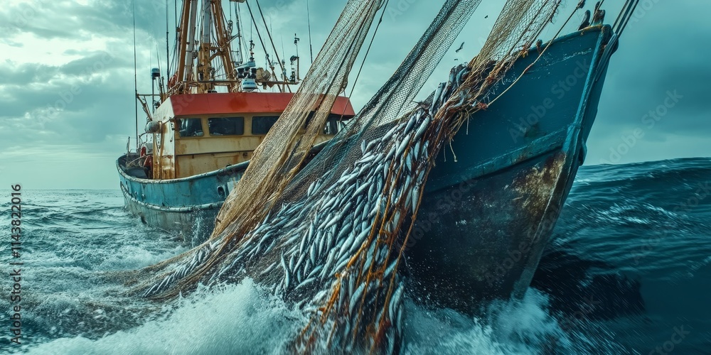 Fishing boat engaged in the process of hauling large nets filled with sardines, showcasing the dynamic activity of fishing boats and the abundant catch of sardines in the sea. #1143822016
