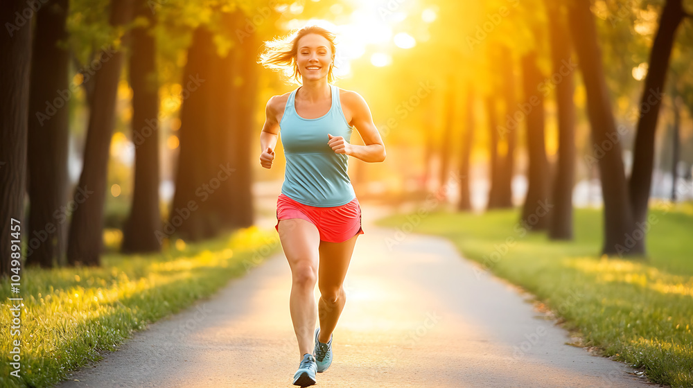 Fit woman jogging in a park during sunset #1049891457
