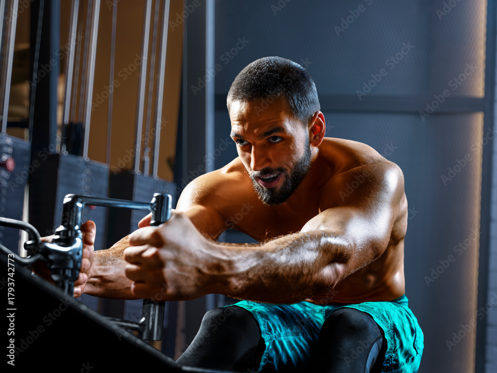 Fit young man in sportswear riding a stationary cycling bike in modern gym. Fitness and health care concept. #1793742773
