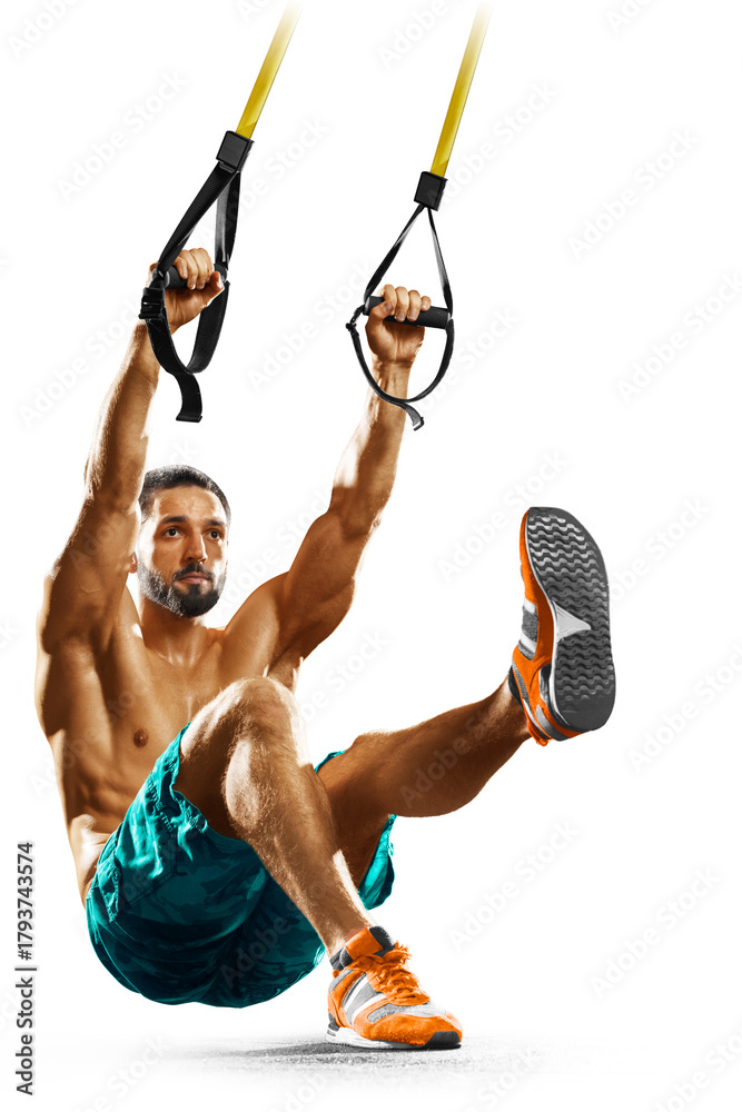 Fitness man. Fit young man working out on white background. Photo of muscular fitness model working out with dumbbells, barbell and exercise equipment. Fitness and health concept. Isolated. #1793743574