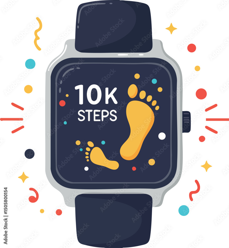 Fitness tracker smartwatch showing 10k steps with colorful confetti illustration #1505800154