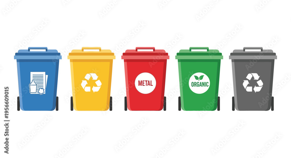 Five colorful recycling bins displaying paper plastic metal organic and general waste symbols a flat vector silhouette high quality professional detailed #1956609015