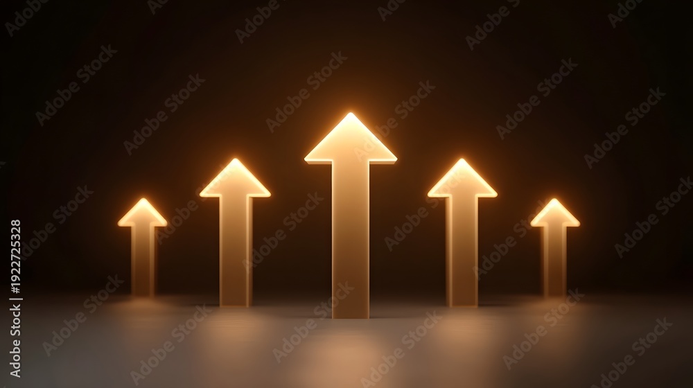 Five illuminated golden arrows ascend in a row representing upward progress growth and success against a dark background #1922725328