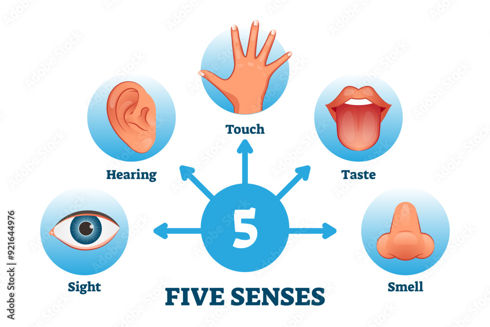 Five senses labeled scheme to receive sensory information illustration, transparent background. Educational collection with sight, hearing, touch, taste. #921644976