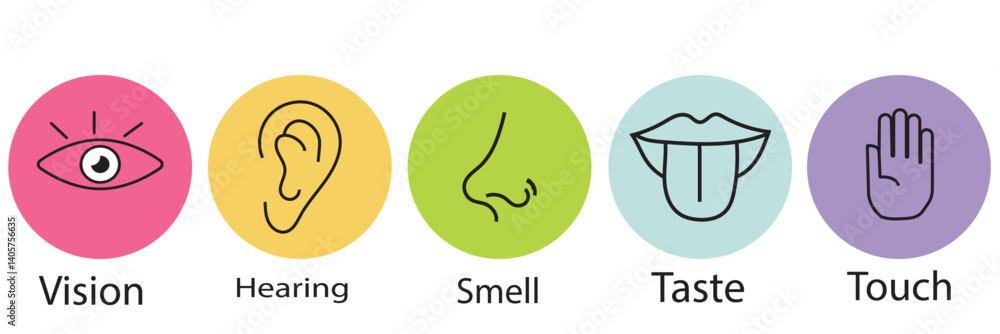 Five senses of human nervous system vector illustration. Vision through eye, smell with nose, taste with tongue line icon set. Variety Design 5 Five senses. #1405756635