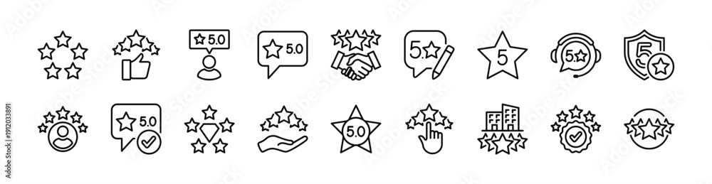 Five stars customer rating review icon set. Contains feedback, satisfaction, experience, quality, comment, response, testimonials for service, support, survey, hotel, security, skill. Vector #1912033891