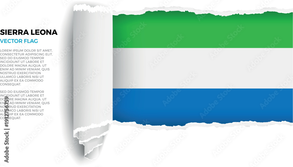Flag of Sierra Leona. Flag revealed through torn paper rolled up on a transparent background #1912756759