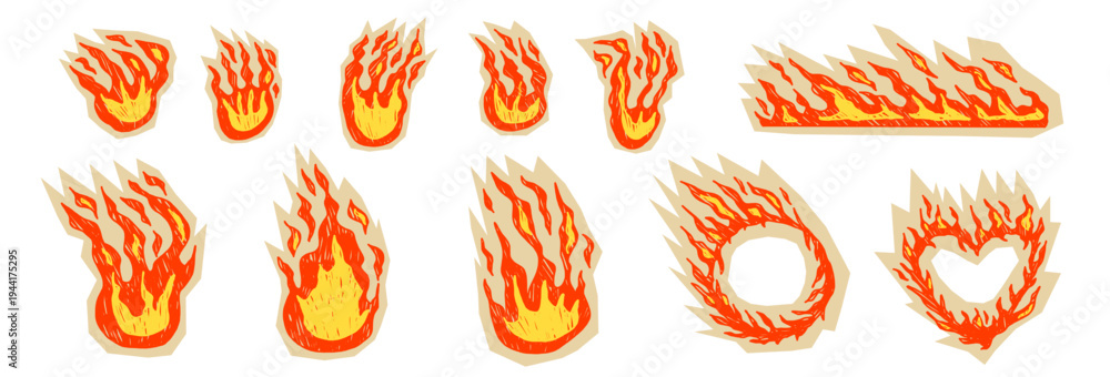 Flame doodles in crayon chalk, hand-sketched fire with grunge textures. Retro promo sticker graphics and rough brush strokes for creative project. Vector bonfire and hot sale frames, borders isolated. #1944175295