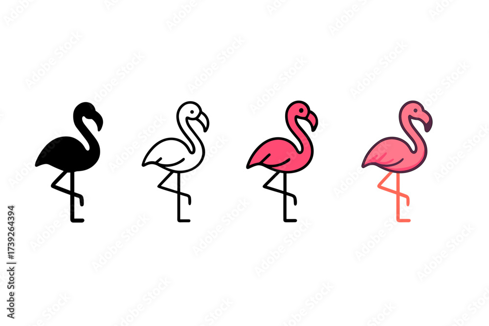 Flamingo Icon Styles. Vector icon flamingo standing same pose same proportions four styles black solid glyph outline minimal flat multicolor filled cartoon #1739264394