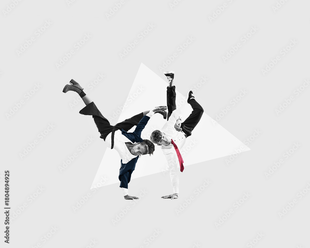 Flat design. A group of multicultural young business people are breakdancing outdoors in business outfits. #1804894925