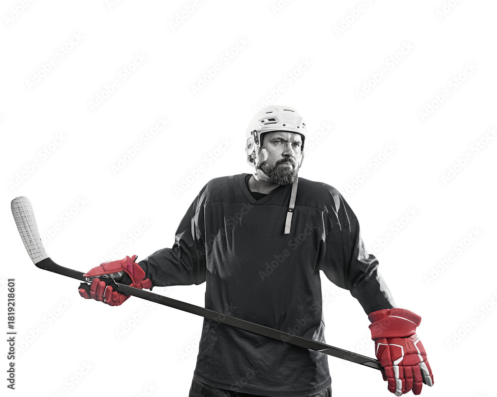 Flat design poster. Hockey player isolated free png background - stadium. Ready to shoot goal. Copy Space. #1819218601