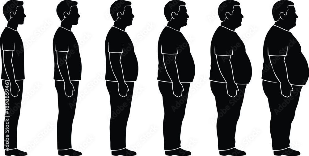 Flat design side view progression of male silhouettes showing gradual weight gain from lean to obese standing in profile with simple black and white minimal contrast #1898859461