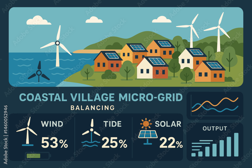 Flat energy-island scene with turbine, tide buoys, PV roofs, and monitor #1460052946