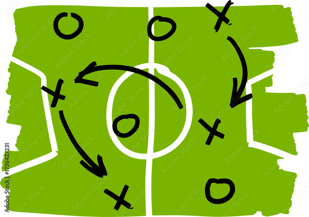 Flat green soccer field with tactical strategy game overlay. Playbook design for coaching diagram or sports education. #1736427231