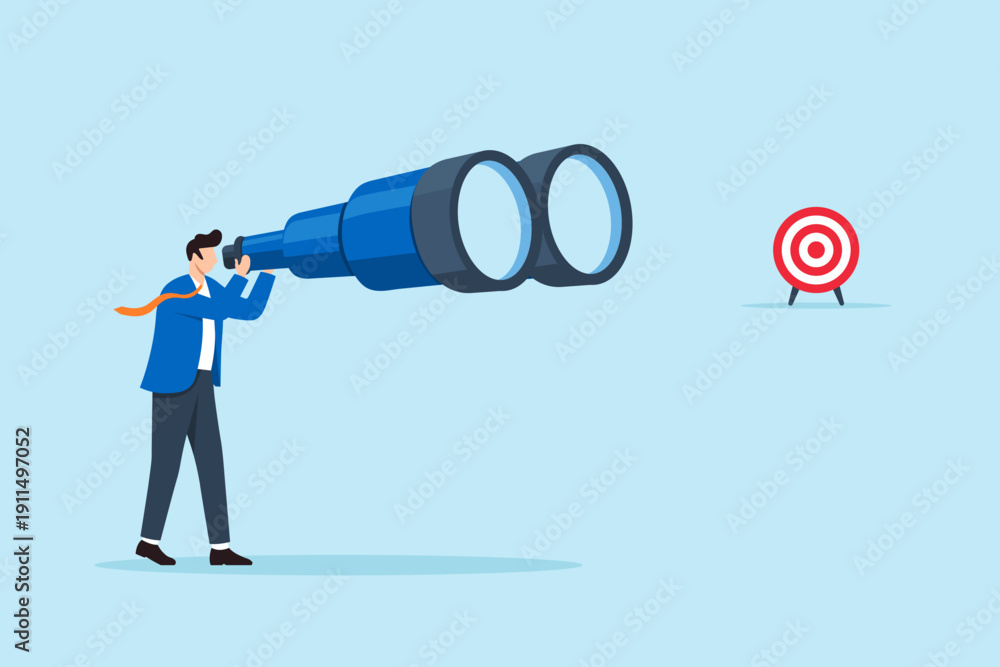 Flat illustration of businessman looking through giant binoculars to clearly identify distant target strategic vision long term planning focus clarity and business goal alignment #1911497052
