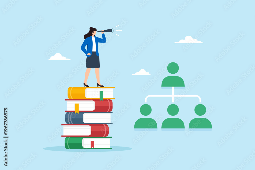 Flat illustration of businesswoman standing on tall stack of books using telescope searching talent for recruitment and career growth strategy #1967786575