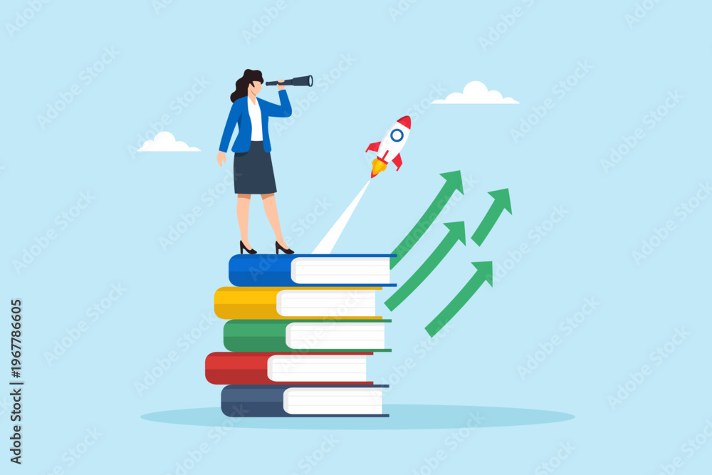 Flat illustration of businesswoman standing on tall stack of books using telescope watching rocket launch symbolizing startup business growth and career development strategy #1967786605