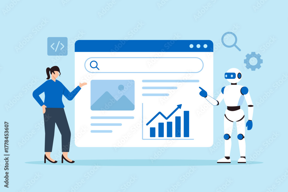 Flat illustration of female character collaborating with AI robot to browse internet and analyze digital information for SEO optimization and web search #1778453607