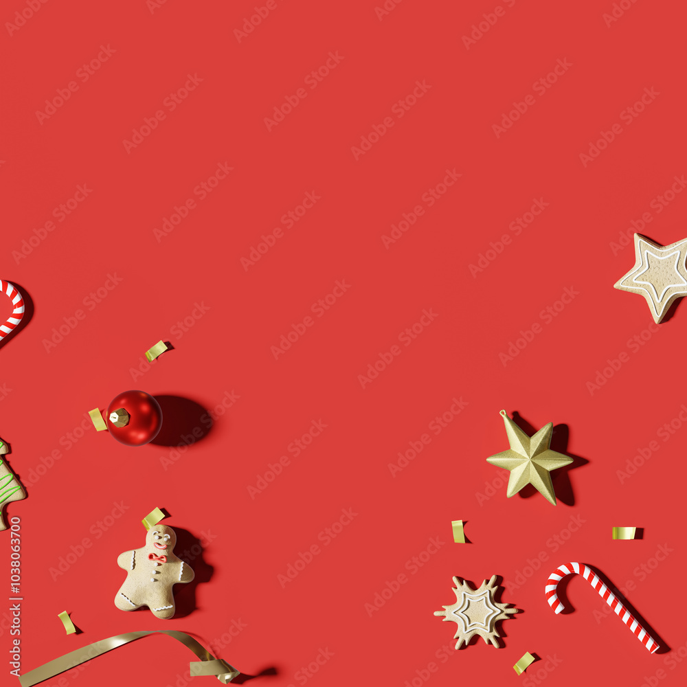 Flat lay Christmas decorations on red background. 3d rendering #1038063700