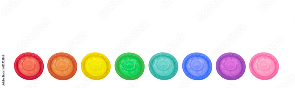 Flat lay composition with colorful condoms on white background, space for text. LGBT concept #483723148