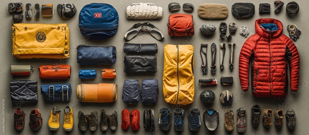 Flat lay of camping and hiking equipment, including backpacks, sleeping bags, clothing, shoes, and accessories on a grey background. #1073476750