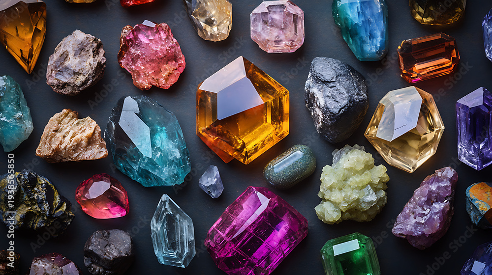 Flat lay of gemstone collection with chrysoberyl in center glowing vividly #1938565850