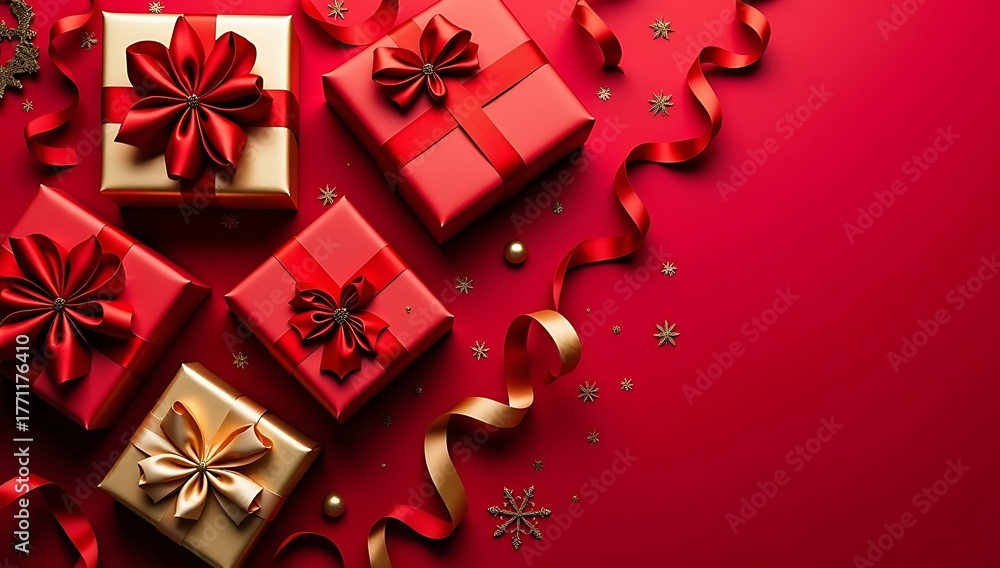 Flat lay of red and gold wrapped gift boxes with ribbons and bows on a red background, symbolizing holiday joy and giving. #1771176410