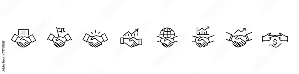 Flat outline handshake partnership icon set showing trust collaboration, business deal agreement, global success, financial growth, teamwork connection, and strategic cooperation symbolizing unity #1777141025