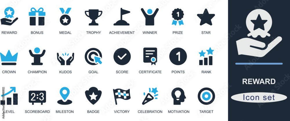 Flat solid black reward icon set featuring trophy, medal, badge, gift, achievement, prize, star, loyalty, winner, and celebration. Perfect for business and app UI design. #1508948802
