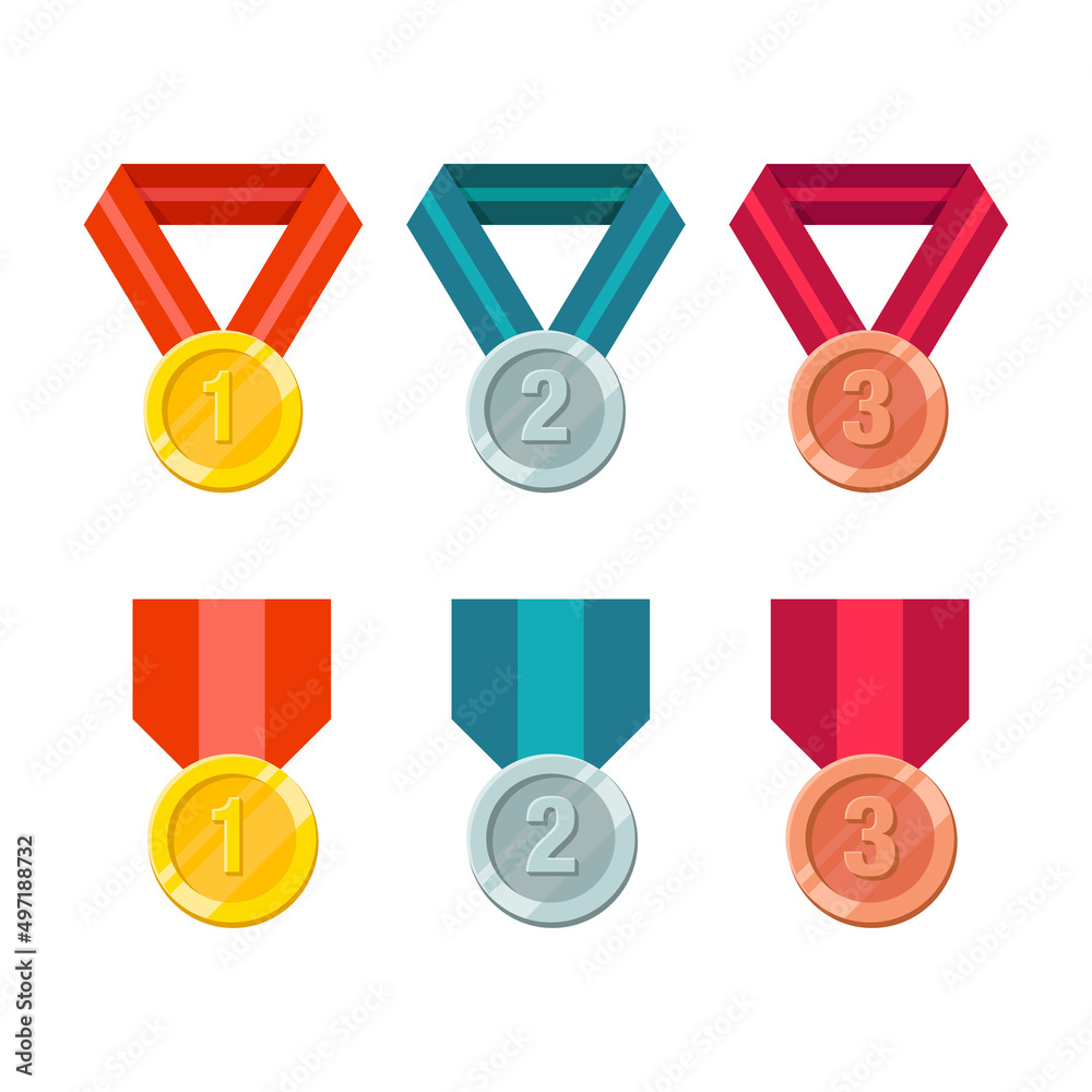 Flat vector illustration of award medal. Suitable for design element of gold, silver, and bronze medal. Medal badge with ribbon collection. #497188732