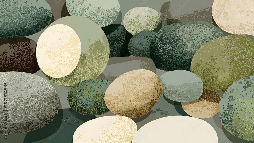 Flat vector illustration of moss-covered river stones with clean shapes, muted green and beige tones, natural texture-inspired design for patterns, backgrounds, and decorative use #1971314565