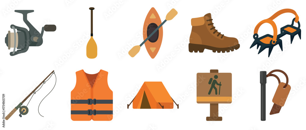 Flat vector illustrations of fishing, hiking, kayaking, and camping gear including boots, tent, life vest, and paddle #1754863709