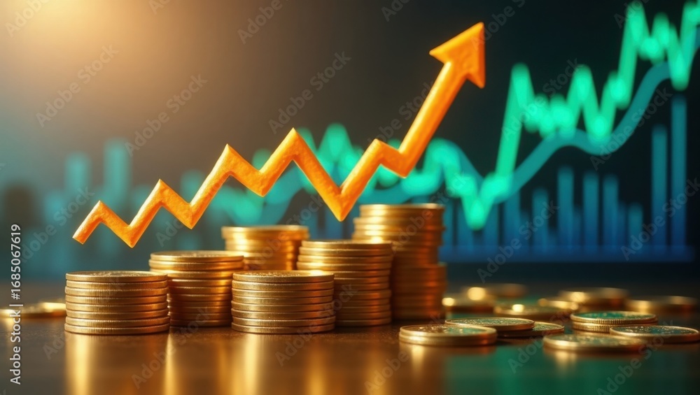 Flechas doradas que se elevan dinámicamente desde pilas de monedas, con gráficos brillantes en el fondo, simbolizando el crecimiento financiero, el progreso y el éxito #1685067619
