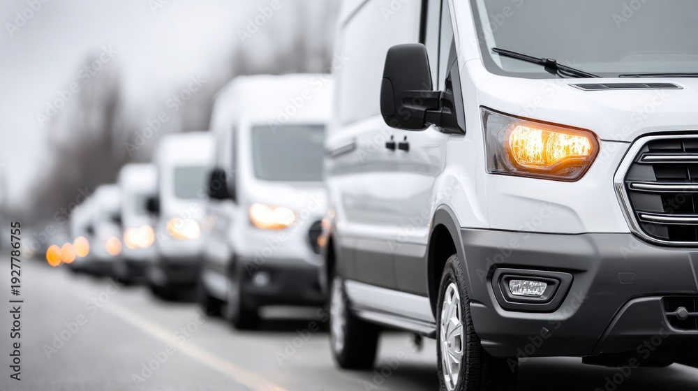 Fleet of white delivery vans lined up on a road during daytime #1927786755