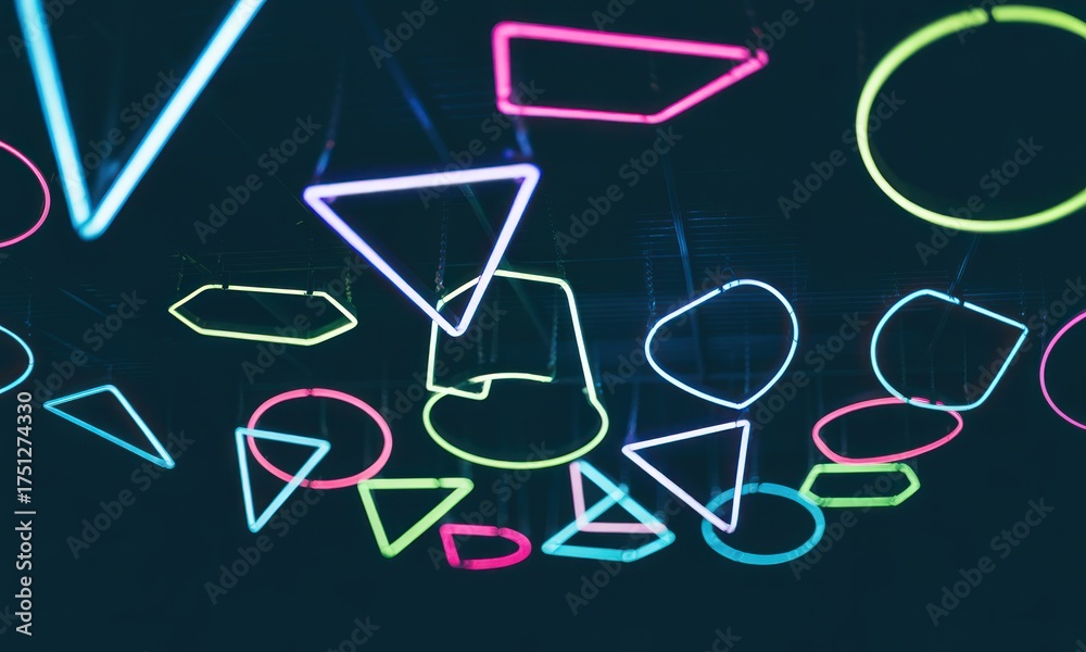 Floating, colorful neon shapes, different sizes, hanging against dark backdrop, illuminated #1751274330