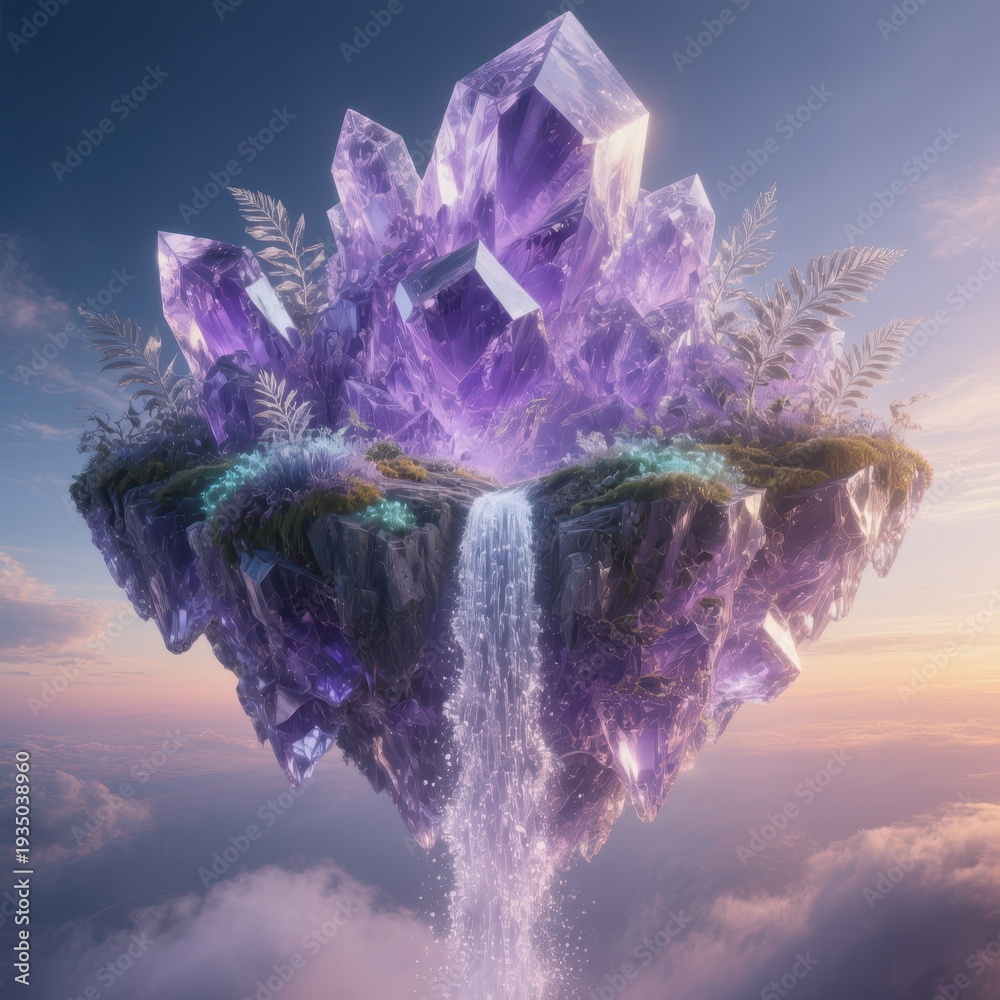 Floating Crystal Island With Waterfall Amidst Clouds Purple Gemstone Landscape Fantasy Sky Scene #1935038960