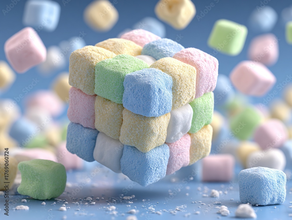 Floating cube made of pastel marshmallows surrounded by scattered sweets, symbolizing creativity, softness, and playful imagination in dreamy confectionery art design #1769060724